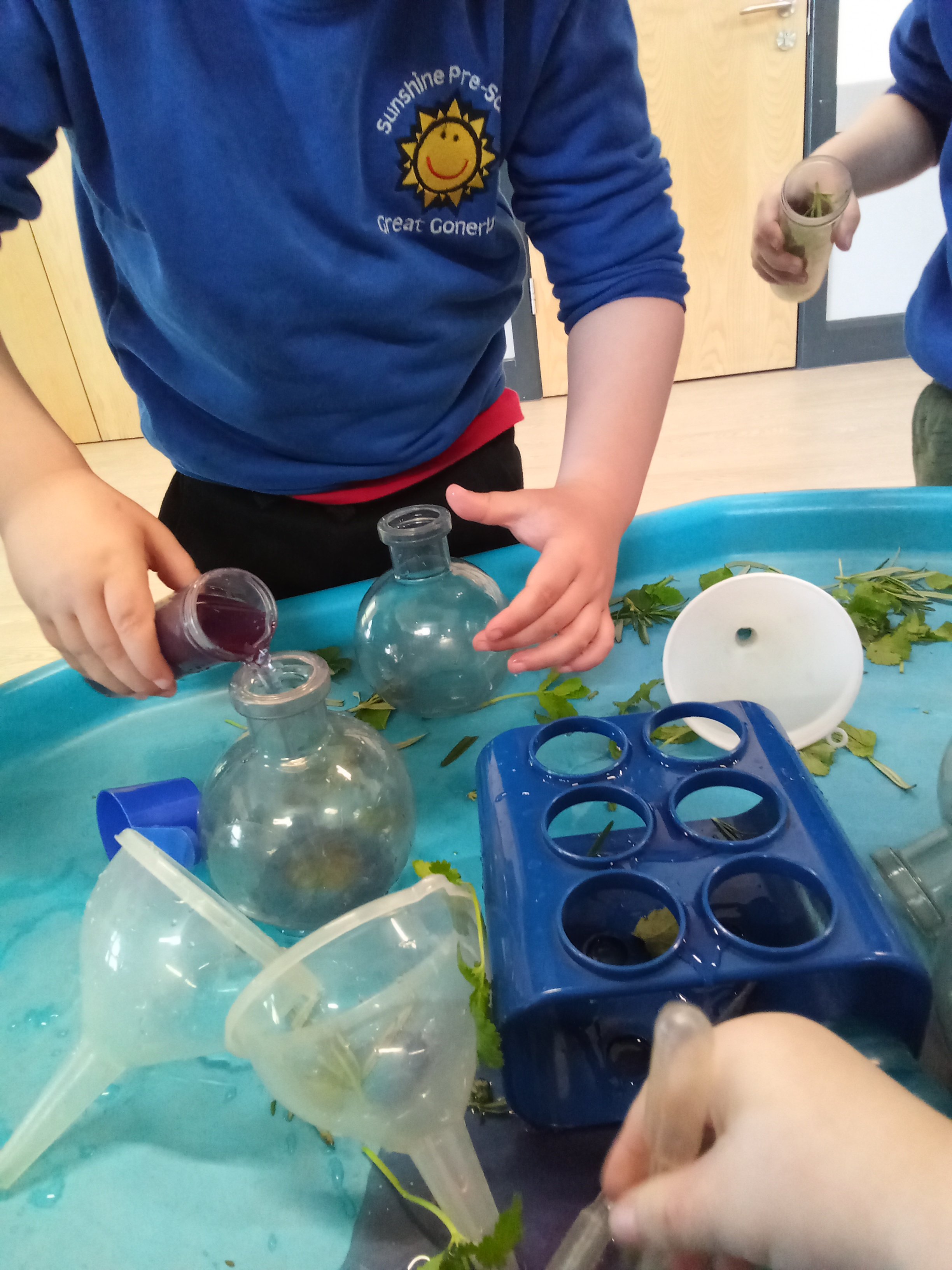 They explored herbs - mint, basil, coriander, rosemary and thyme. They used them in water to make potions and in playdough to squish into the dough. They commented on the different smells, some they liked and some they were not so keen on.